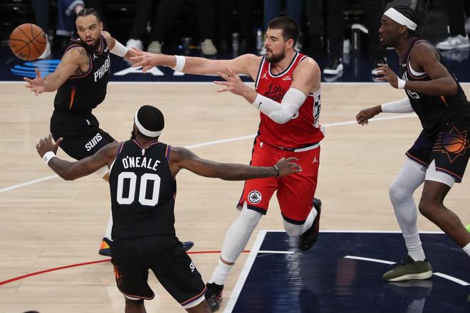 太陽隊的布克上半場得到13分和7次助攻,吉萊斯皮得到12分;快船隊的祖巴茨和科林斯各得到9分。