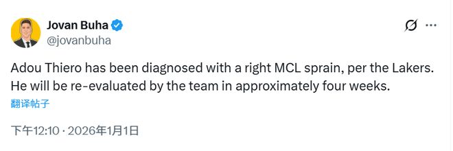 北京時間1月1日,湖人官方表示,新秀前鋒阿杜-蒂耶羅被診斷為右膝內側副韌帶扭傷。他將在大約四周後接受隊醫的複查。這意味著蒂耶羅將至少缺席四周的比賽。目前,湖人的傷病名單上還有八村壘、文森特和裏夫斯。