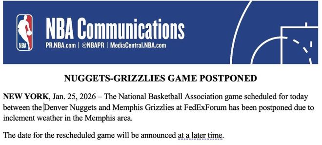 掘金對灰熊比賽,是因為孟菲斯地區遭遇凍雨和雨夾雪極端天氣,導致電線結冰引發大規模停電、道路封閉。