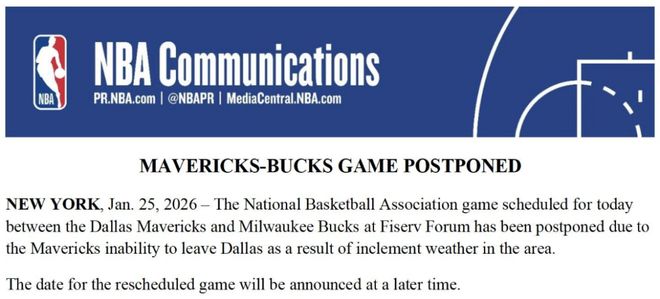今天,NBA官方宣布, 獨行俠對陣雄鹿,掘金對陣灰熊,因當地惡劣天氣,比賽取消延期。