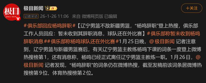 而在最新的消息中,已經有記者打電話去詢問遼寧男籃俱樂部,俱樂部工作人員回應,目前暫時沒有收到楊鳴的辭職申請,球隊還在外比賽。