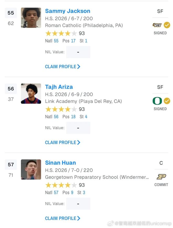 本周更新的Rivals2026屆全美高中生排名,張博源上升至第25位,成為該榜單曆史上排名最高的中國球員,另外,同批的國青內線核心郇斯楠則排名57位,兩人同為四星高中生 。