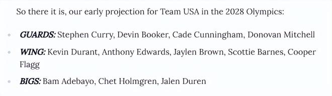 杜蘭特也並未宣布退出,他在接受ESPN記者古德威爾采訪時,明確表態自己願意出戰2028年洛杉磯奧運。美媒ClutchPoints隨後對2028年美國男籃的名單展開分析——