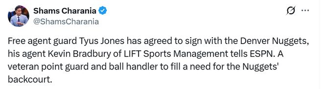 名記Siegel跟進報道稱,瓊斯與獨行俠達成買斷,是想加盟一支具備季後賽競爭力的球隊,並在球隊中擔任替補貢獻者。如今他得到了這樣的機會 —— 將在掘金擔任賈馬爾-穆雷身後的主要替補後衛,這與2023年雷吉-傑克遜在掘金的角色相似。