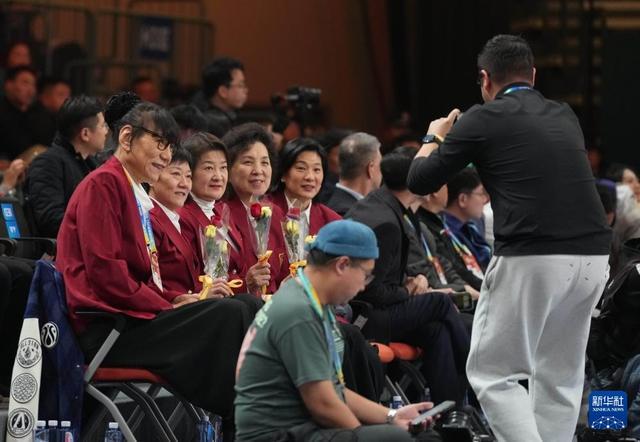 3月7日,在場邊觀賽的中國籃球名人堂成員鄭海霞(左一)等在接受獻花後合影。新華社記者 孟永民 攝