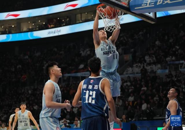 3月7日,CBA星銳隊球員楊騰飛(上)在比賽中扣籃。新華社記者 孟永民 攝