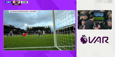 “主裁判宣布:‘經回放確認,球擊中了水晶宮23號球員,這是一次意外手球,並非故意,因此判罰點球,但由於是意外,所以隻出示黃牌’。”