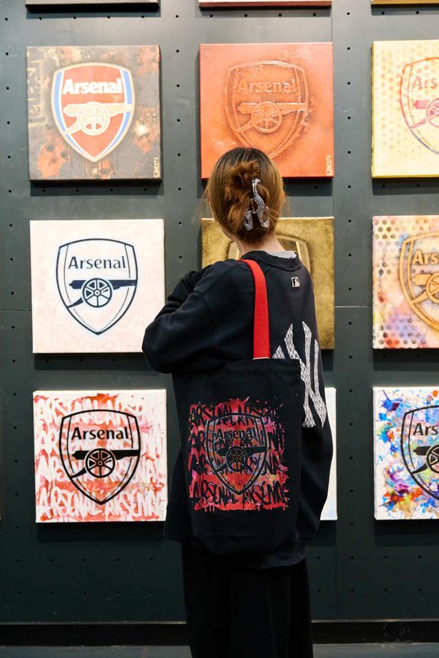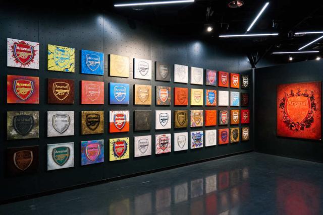 徽章係列既是致敬,也是再創。藝術家海登·波恩用他顛覆性的視覺語言,將沉甸甸的榮耀與記憶,燃成觀眾眼前流動的火焰。在徽章子係列作品中,最為震撼的當屬《Arsenal》。它由48件小幅徽章作品搭配1件大幅徽章作品,共同組成“49”矩陣,在展廳牆麵整齊排布。“49”對阿森納而言具有特殊意義,它象征著俱樂部在“無敵賽季”期間創下的曆史性連續不敗紀錄,這一紀錄至今無人超越。而《傳承》《流行》《街頭》《特別版》等子係列,則分別運用歲月肌理、波普色彩、街頭塗鴉乃至中國祥雲龍紋,為阿森納徽章書寫下跨越時間與文化的多重注腳。