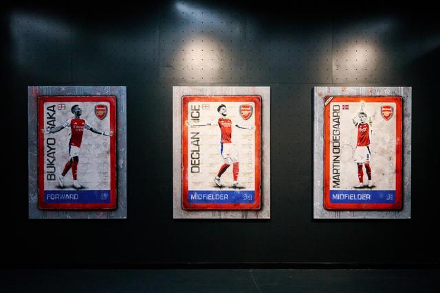 球員係列則聚焦於阿森納故事中個體的力量,是整個展覽中最能點燃個人記憶的部分。厄德高的靈光、賴斯的堅毅、薩卡的鋒芒,還有傳奇隊長亞當斯穿越時光而來的鐵血風骨,都以充滿生命力的方式在畫布上奔騰。藝術家的創作並未追求寫實肖像,而是捕捉每位球員獨一無二的“氣場”,通過動作、色彩與動態線條傳達情緒印象與精神特質。其中,《收藏品》係列作品的視覺靈感,來源於懷舊風格的交易卡,將阿森納現役球員與曆史上的傳奇球員,轉化為可收藏的藝術瞬間。