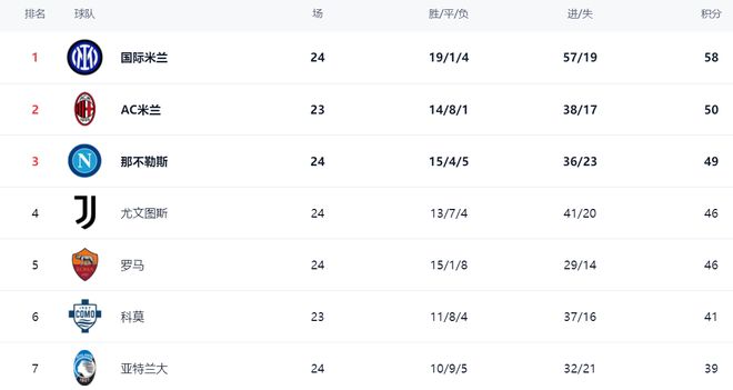 在積分榜上,國際米蘭以58分排名榜首,戰績是19勝1平4負。國際米蘭雖然輸球的場次不算少,但平局極少,贏球的場次聯賽最多,讓國際米蘭得以占據第1的位置。AC米蘭隻拿到50分,排名第2,足足落後了8分。不過,A米蘭少踢1場。